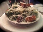 Family style is the way to go. Don’t fight it – just do it. If you try to order by yourself you will be disappointed, probably over-order and end up with a bill you’re not pleased with. You’ll want to try a little bit from each section of the menu anyway. The menu is divided into six sections (eight if you include the daily seafood selection and dessert): Antipasti, Zuppa e Insalate, Macaroni, Pesci, Carni and Contorni. Let’s start from the top. Before you even get the food you order there will be a pleasant surprise coming to your table. A fresh bread basket with several varietals, thick chunks of parmesan, a little charcuterie and some pickled cauliflower for noshing purposes. A generous touch and a pleasant pre-dinner snack. Now, on to the main event. The Baked Clams appetizer is great for sharing. You get nine clams baked in three different styles – classic, casino and one variety topped with sea urchin. It was a little much for two people, but don’t worry we cleaned the plate. On the topic of salad, Carbone has a pretty impressive Caesar. Not too much dressing, not too heavy, great croutons and well portioned. I glanced at the Caprese served at the table next to us which looked delicious as well. Fresh mozzarella that the server sliced in front of the table with very ripe and fresh-looking tomatoes. A perfect summer treat and I am sure it tasted just as it would if you were on the Italian coast. OK, maybe not quite, but close enough.